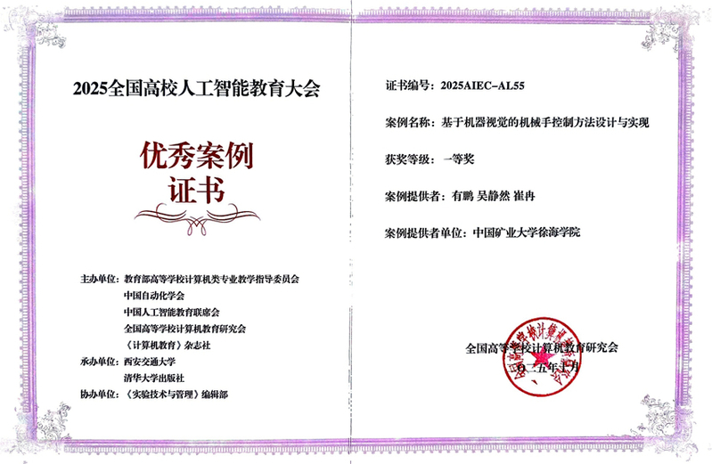 在大会优秀案例评选中,由徐海学院教师有鹏、吴静然、崔冉合作完成的《基于机器视觉的机械手控制方法设计与实现》,荣获“优秀案例一等奖”。该成果充分体现了学院在产教融合与教学创新方面的前沿探索与实践成效。